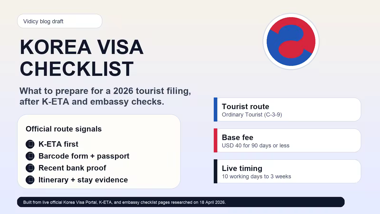If you are searching for a Korea visa checklist, start with the answer that saves the most wasted work: some travelers should not build a C-3-9 tourist visa file at all. As of April 18, 2026, the official Korea Visa Portal, the official K-ETA site, and current embassy checklist pages all point to the same decision order. First check whether your passport can enter with K-ETA or a current K-ETA exemption. If it cannot, or if your K-ETA is denied, build a C-3-9 ordinary tourist visa file with the mission-specific documents your embassy asks for.